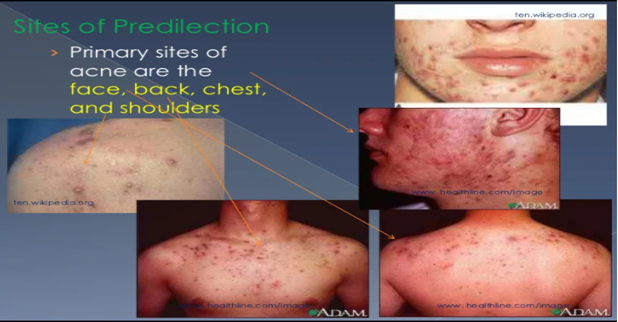 Lokasi yang sering : wajah, leher, bahu, lengan atas, dada dan punggung. Meski jerawat dapat timbul di daerah kulit lain yang mengandung kelenjar sebasea misalnya pada bokong dan paha.